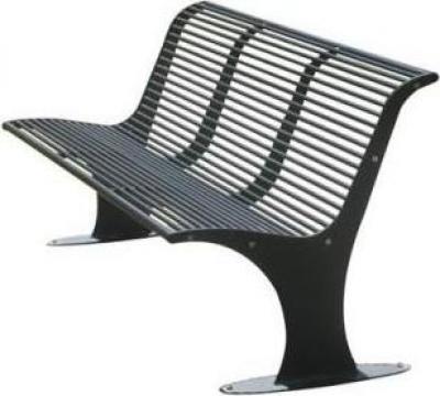 Banca realizata din otel, cu laterale din tabla de 8 mm grosime taiate prin tehnologia laser si sudate pe talpi eliptice 600x150x8 mm, baza de fixare pe beton.